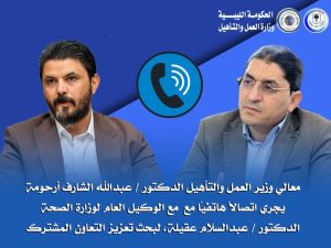 • أجرى معالي وزير العمل والتأهيل الدكتور / عبدالله الشارف أرحومة، اتصالًا هاتفيًا مع الوكيل العام لوزارة الصحة الدكتور / عبدالسلام عقيلة، وذلك في إطار تعزيز التنسيق الحكومي وتكامل الجهود بين القطاعات الحيوية.