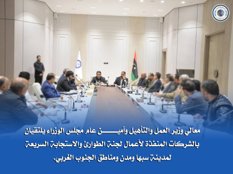 في إطار متابعة ومعالجة ملف الشركات المنفذة لأعمال لجنة الطوارئ والاستجابة السريعة لمدينة سبها معالي وزير العمل والتأهيل يلتقي رئيس لجنة متابعة ومعالجة ملف الالتزامات المالية بناءً على استدعاء رئاسة اللجنة لبحث آلية صرف مستحقات الشركات.
